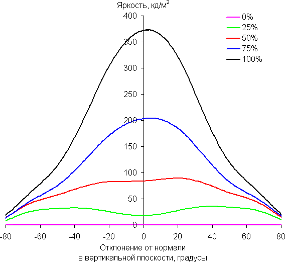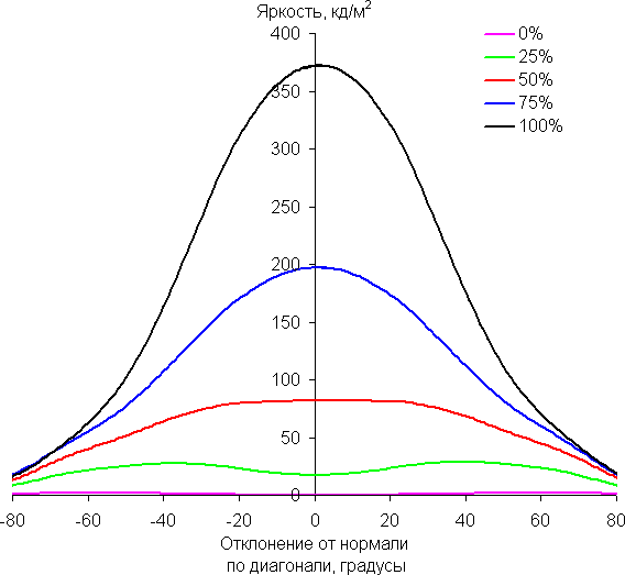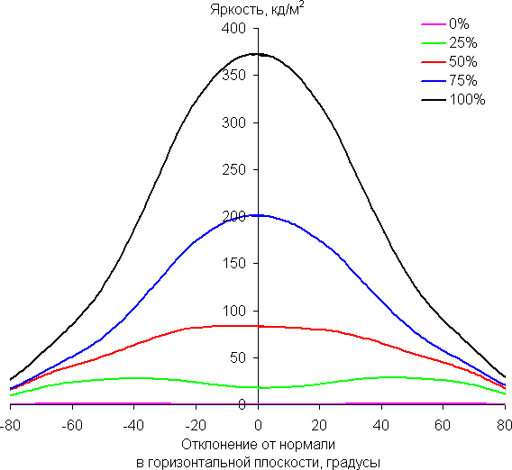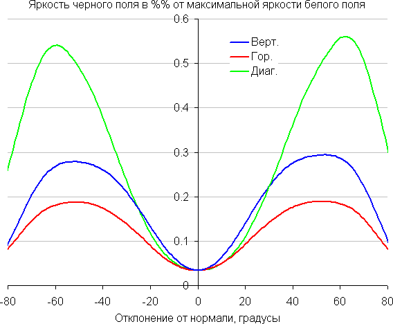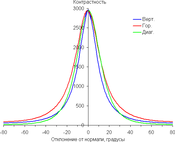 По скорости падения яркости углы обзора не очень широкие. Отметим примерно одинаковый характер уменьшения яркости при отклонении от перпендикуляра к экрану во всех трех направлениях, при этом графики не пересекаются в значимом диапазоне измеряемых углов. При отклонении в диагональном направлении яркость черного поля достигает большего значения, чем в двух других случаях. Однако максимум яркости черного поля все равно меньше, чем в случае типичного монитора на матрице IPS. Контрастность в диапазоне углов ±82° остается выше значения 10:1.