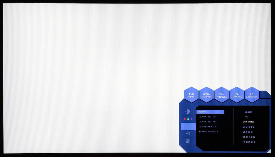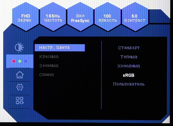 Настроек, влияющих на яркостный и цветовой баланс, не очень много, что для игрового монитора ожидаемо. Есть регулировки яркости (подсветки) и контрастности, функции принудительного снижения интенсивности синей компоненты и динамической регулировки яркости подсветки. Можно корректировать цветовой баланс выбором цветового профиля из четырех предустановленных или пользовательского, в котором цветовой баланс можно подправить регулировками интенсивности трех основных цветов.