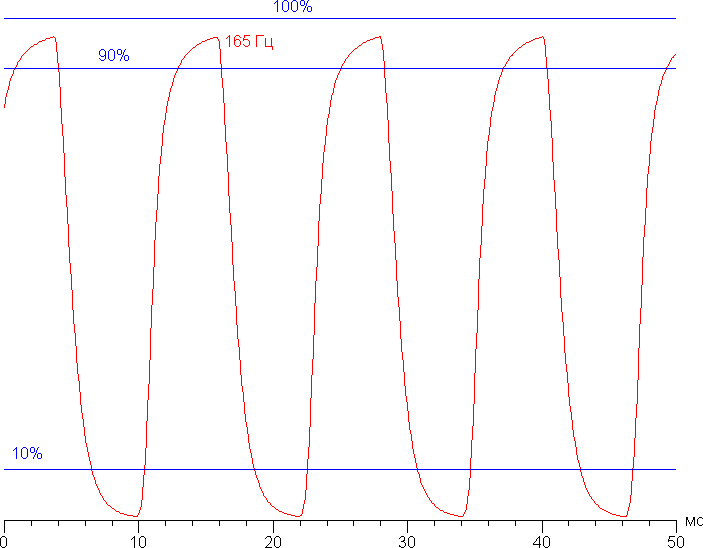 Приведем зависимости яркости (вертикальная ось) от времени (горизонтальная ось) при чередовании белого и черного кадра при 165 Гц кадровой частоты: