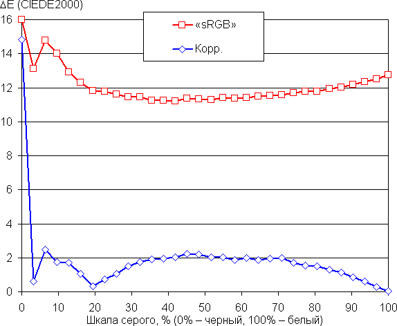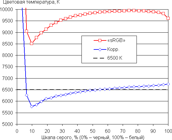 Цветовой баланс в самом ярком режиме (то есть без коррекции — профиль «sRGB») сильно отличается от стандартного, так как цветовая температура на шкале серого гораздо выше стандартных 6500 К, а отклонение от спектра абсолютно черного тела (параметр ΔE) выше 10 единиц. Мы попытались его улучшить, регулируя усиление трех основных цветов. Удалось хорошо приблизить цветовую температуру к 6500 К и снизить ΔE, правда максимальная яркость (и контрастность) снизилась в 1,4 раза. Графики ниже показывают цветовую температуру на различных участках шкалы серого и ΔE в случае отсутствия вмешательства и после ручной коррекции (R = 50, G = 42, B = 39):