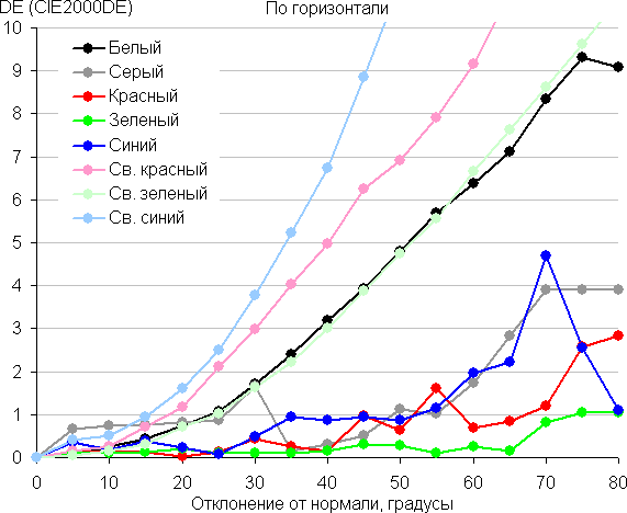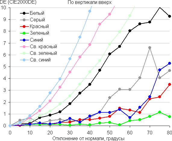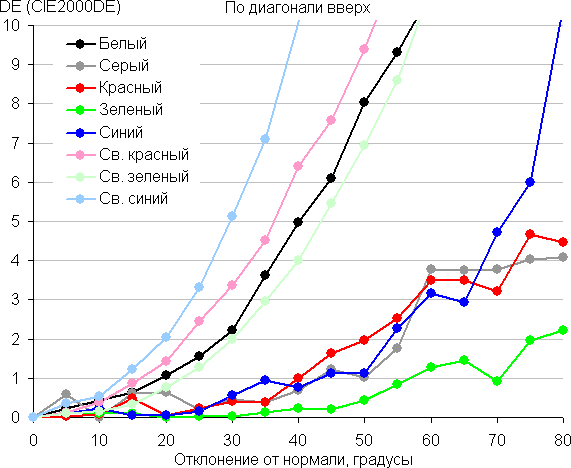 Для количественной характеристики изменения цветопередачи мы провели колориметрические измерения для белого, серого (127, 127, 127), красного, зеленого и синего, а также светло-красного, светло-зеленого и светло-синего полей во весь экран с использованием установки, подобной той, что применялась в предыдущем тесте. Измерения проводились в диапазоне углов от 0° (датчик направлен перпендикулярно к экрану) до 80° с шагом в 5°. Полученные значения интенсивностей были пересчитаны в ΔE относительно замера каждого поля при перпендикулярном положении датчика относительно экрана. Результаты представлены ниже: