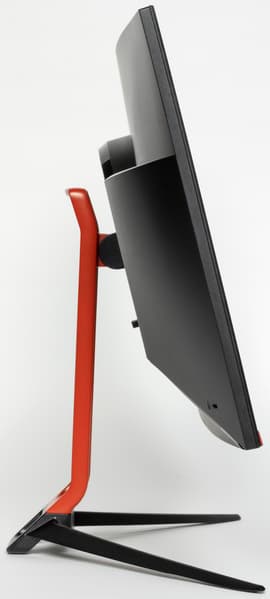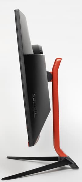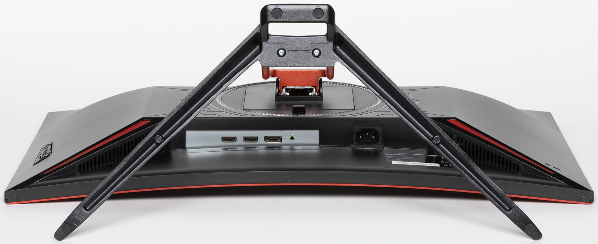 Дизайн обозначает игровую направленность монитора. Внешние элементы блока экрана и кожух узла крепления блока экрана изготовлены из черного пластика в основном с матовой поверхностью, но встречаются и глянцевые участки. Ориентацию на игроков выдают трехпалое основание подставки, изготовленное из алюминиевого сплава и имеющее стойкое матовое черное покрытие, красная стойка, изготовленная из такого же материала, красная пластиковая планка в нижней части экрана, а также оформление задней панели и подсветка на ней. Внешняя поверхность матрицы черная, полуматовая (зеркальность хорошо выражена), внешний слой матрицы жесткий. Плоскость экрана изогнута по цилиндру так, что правый и левый край немного выдвинуты вперед. Согласно нашим оценкам, радиус изгиба в центральной части экрана равен порядка 1,8 м, но к краям экран становится все более плоским на расстоянии 12 см от края кривизна пропадает, что, впрочем, характерно для всех изогнутых ЖК-экранов. Спереди экран выглядит как монолитная поверхность, ограниченная снизу неширокой планкой, а по периметру — узкой окантовкой. Выведя изображение на экран, можно увидеть, что на самом деле между внешними границами экрана и собственно областью отображения есть неширокие поля.