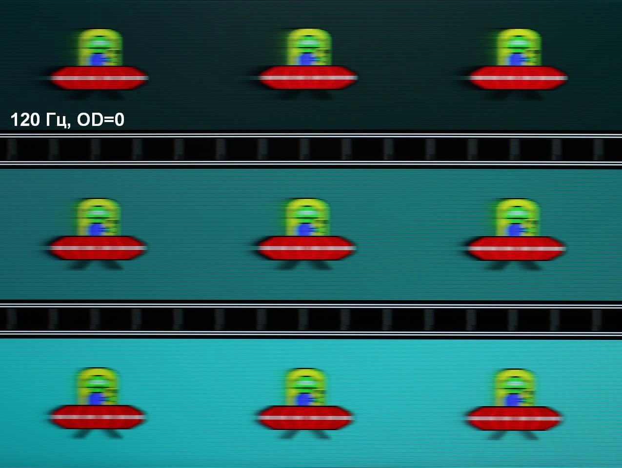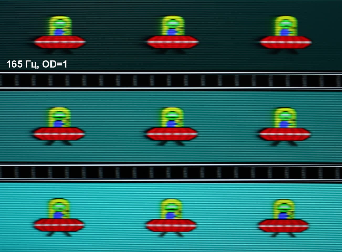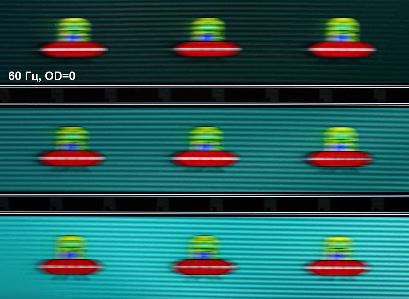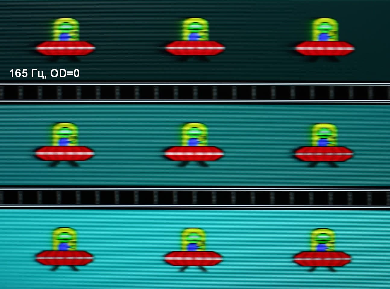 Для наглядного представления о том, что на практике означает такая скорость матрицы, и какие могут быть артефакты от разгона, приведем серию снимков, полученных с помощью движущейся камеры. Такие снимки показывают, что видит человек, если он следит глазами за двигающимся на экране объектом. Описание теста приведено тут, страница с самим тестом тут. Отметим, что получить хорошие по качеству снимки в этом тесте в случае изогнутого монитора сложно. Использовались рекомендованные установки (скорость движения 960 или 990 пиксель/с, то есть на целое число пикселей за кадр), выдержка 1/15 с, на фотографиях указаны значения частоты обновления (тесты проводились для трех частот), а также включен ли разгон (OD).