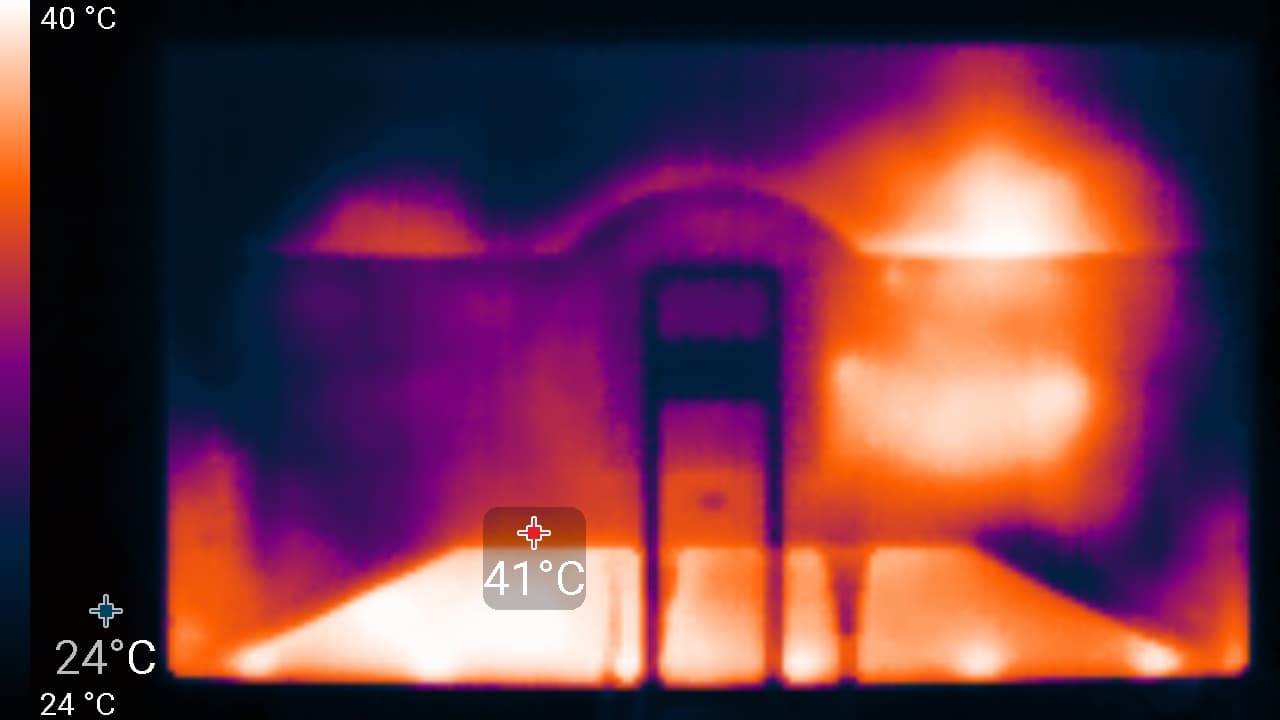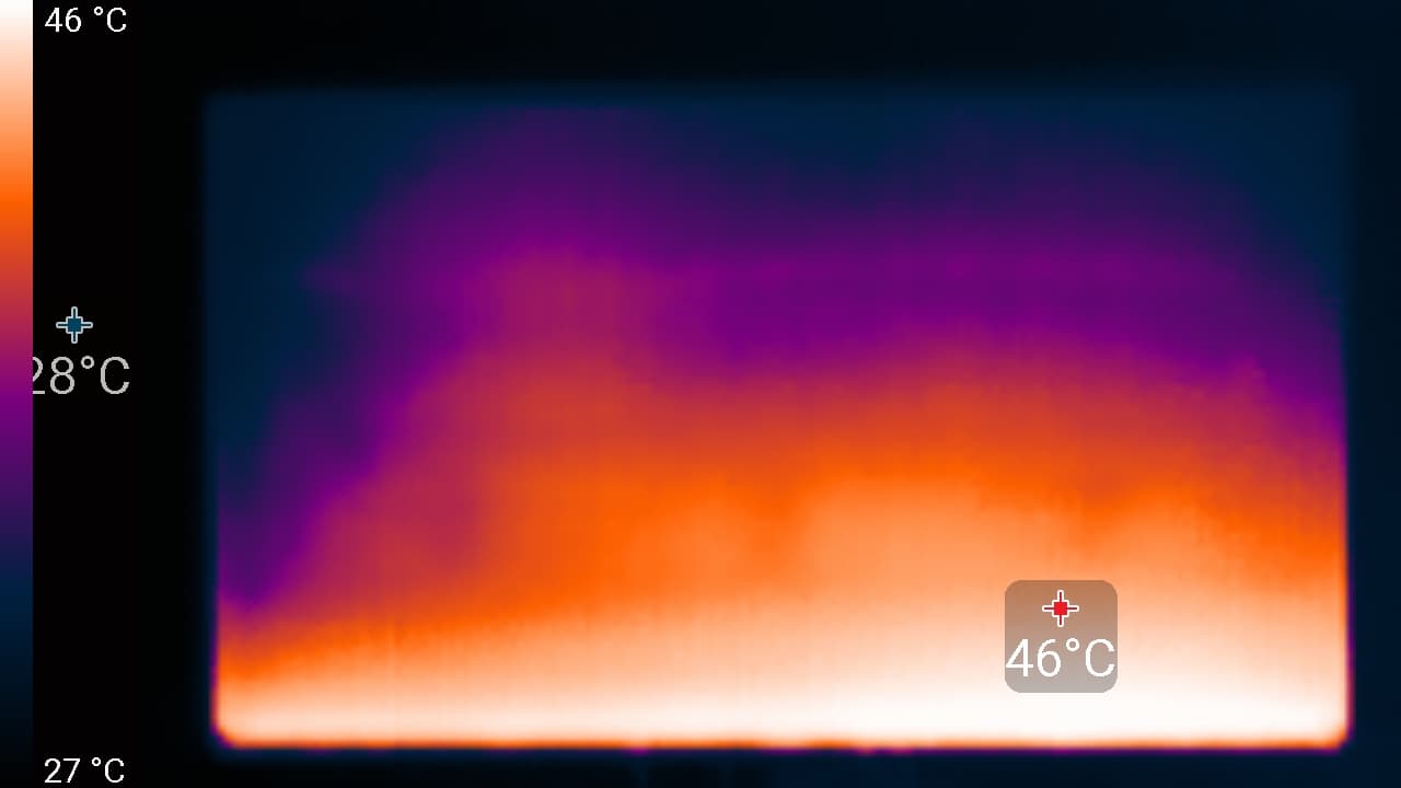 По распределению областей нагрева, можно предположить, что внизу находится светодиодная линейка подсветки экрана. Нагрев монитора умеренный.