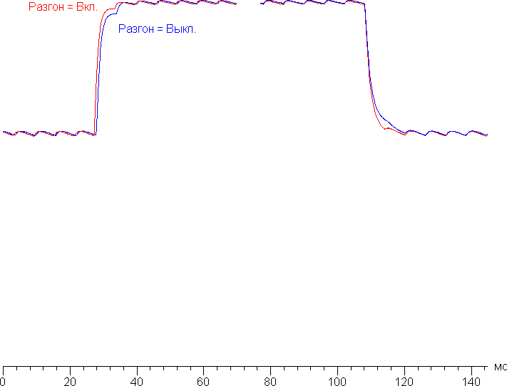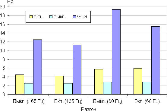 Время отклика зависит от значения настройки Разгон, которая управляет разгоном матрицы. График ниже показывает, как меняется время включения и выключения при переходе черный-белый-черный (столбики «вкл.» и «выкл.»), а также среднее суммарное время для переходов между полутонами (столбики «GTG») для двух значений этой настройки и двух частот обновления: