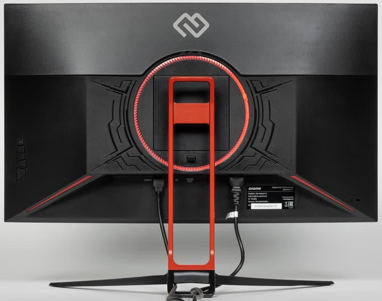 Кабели, идущие от разъемов монитора, можно пропустить через проемы в стойке и в основании подставки. На задней панели вокруг крепежного узла есть рельефная кольцевая вставка из прозрачного пластика, которая подсвечивается несколькими красными светодиодами. В меню монитора подсветку можно включить и выключить.