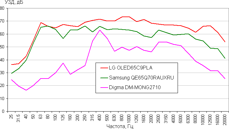 Качество встроенных громкоговорителей также невысокое. Даже для сидящего перед монитором пользователя они негромкие, низких частот нет совсем, есть выраженный «пластиковый» призвук из-за резонансов корпуса, но хоть стереофонический эффект выражен. Сравним АЧХ этого монитора с АЧХ двух телевизоров высшего класса (воспроизводился розовый шум, уровни звукового давления в 1/3 октавах записывал шумомер Октава-111):
