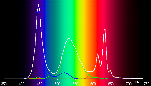 Ниже приведен спектр для белого поля (белая линия), наложенный на спектры красного, зеленого и синего полей (линии соответствующих цветов):