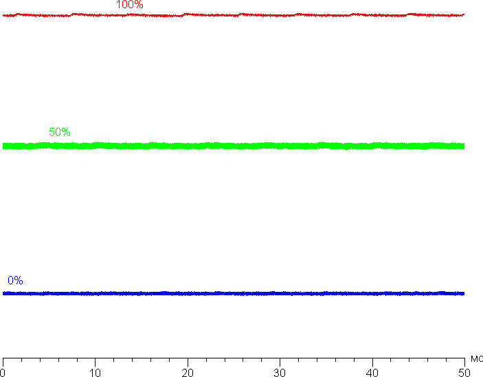 На любом уровне яркости модуляция подсветки отсутствует, что исключает видимое мерцание экрана. Для тех, кто привык распознавать знакомое сокращение, уточним: ШИМ отсутствует. В доказательство приведем графики зависимости яркости (вертикальная ось) от времени (горизонтальная ось) при различных значениях настройки яркости: