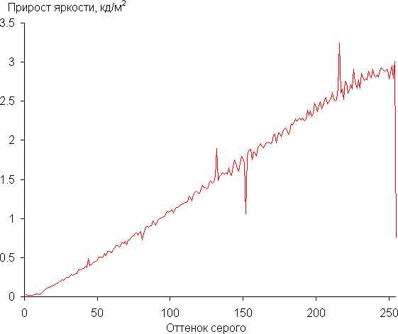 Для оценки характера роста яркости на шкале серого мы измерили яркость 256 оттенков серого (от 0, 0, 0 до 255, 255, 255). График ниже показывает прирост (не абсолютное значение!) яркости между соседними полутонами: