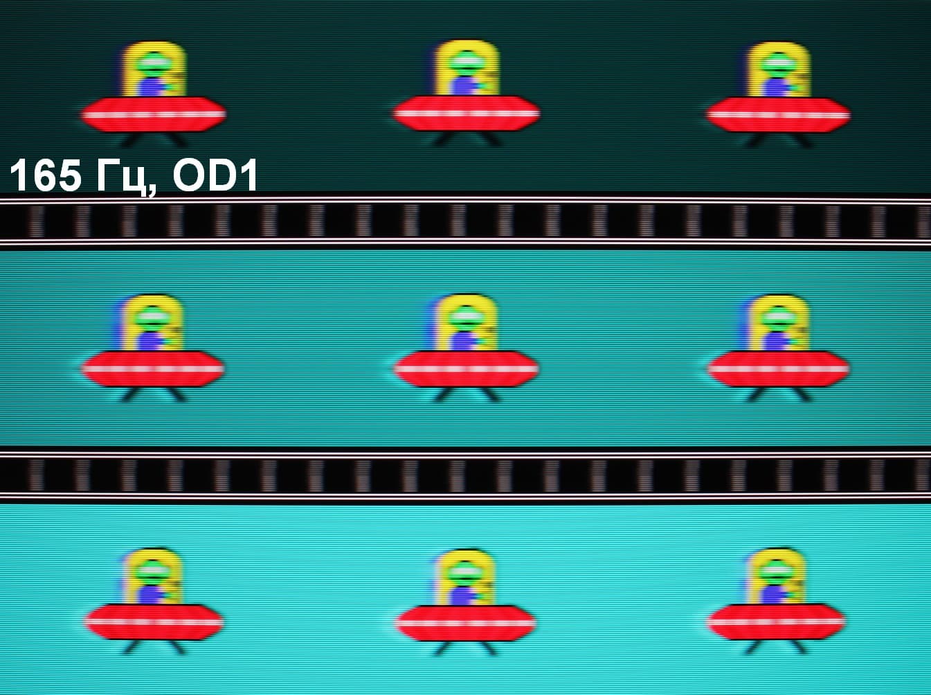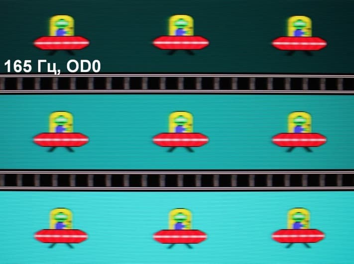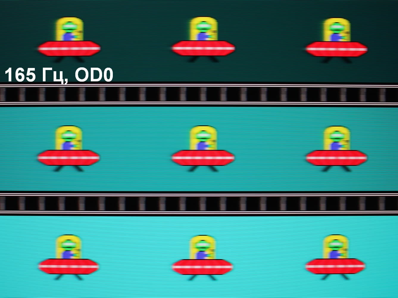 Для наглядного представления о том, что на практике означает такая скорость матрицы, и какие могут быть артефакты от разгона, приведем серию снимков, полученных с помощью движущейся камеры. Такие снимки показывают, что видит человек, если он следит глазами за двигающимся на экране объектом. Описание теста приведено тут, страница с самим тестом тут. Использовались рекомендованные установки (скорость движения 960 пиксель/с для частот обновления 60 и 120 Гц или 990 пиксель/с для 165 Гц, то есть на целое число пикселей за кадр), выдержка 1/15 с, на фотографиях указаны значения частоты обновления, а также ступень разгона (сокращено до OD — от Overdrive) и включена ли функция вставки черного кадра (MPRT).