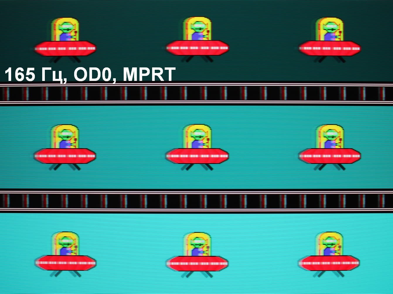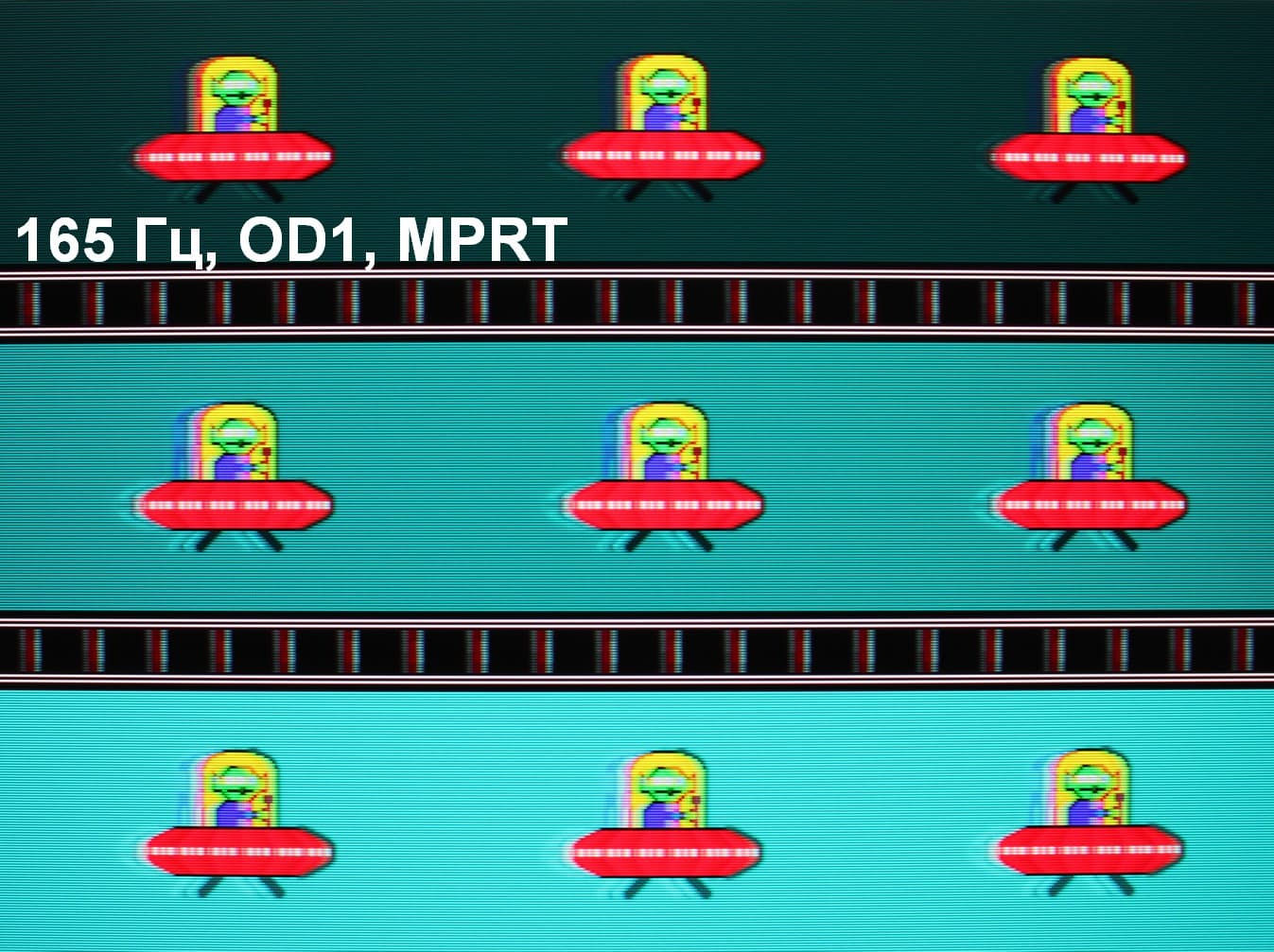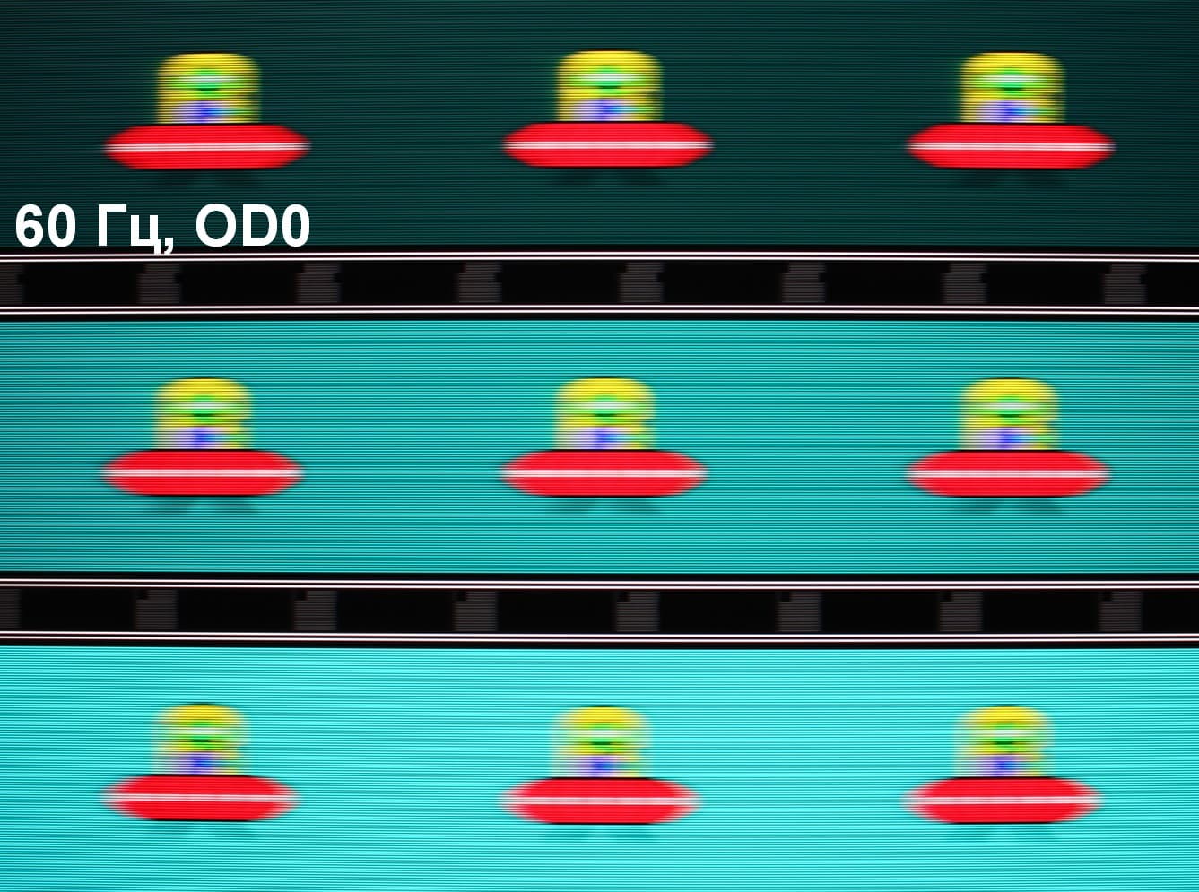 Для наглядного представления о том, что на практике означает такая скорость матрицы, и какие могут быть артефакты от разгона, приведем серию снимков, полученных с помощью движущейся камеры. Такие снимки показывают, что видит человек, если он следит глазами за двигающимся на экране объектом. Описание теста приведено тут, страница с самим тестом тут. Использовались рекомендованные установки (скорость движения 960 пиксель/с для частот обновления 60 и 120 Гц или 990 пиксель/с для 165 Гц, то есть на целое число пикселей за кадр), выдержка 1/15 с, на фотографиях указаны значения частоты обновления, а также ступень разгона (сокращено до OD — от Overdrive) и включена ли функция вставки черного кадра (MPRT).