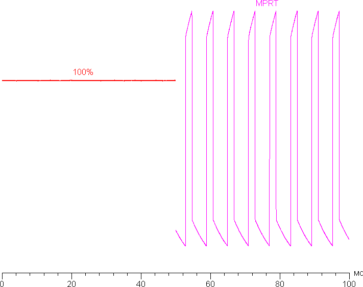 Есть режим со вставкой темного кадра (черным он в данном случае не является) с названием MPRT. Зависимости яркости (вертикальная ось) от времени (горизонтальная ось), когда яркость установлена на максимум (левая половина — 100%), и когда включена функция MPRT (правая половина):