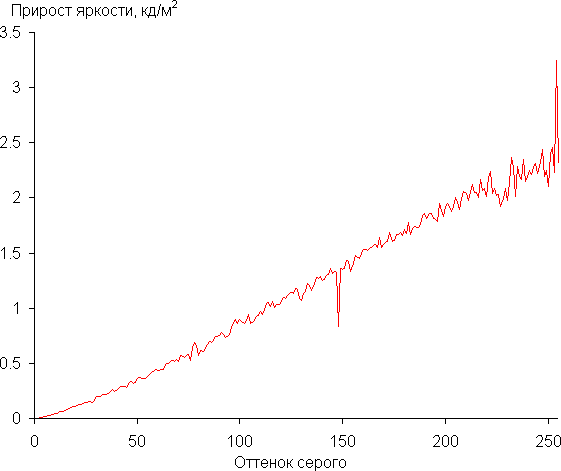 Для оценки характера роста яркости на шкале серого мы измерили яркость 256 оттенков серого (от 0, 0, 0 до 255, 255, 255). График ниже показывает прирост (не абсолютное значение!) яркости между соседними полутонами: