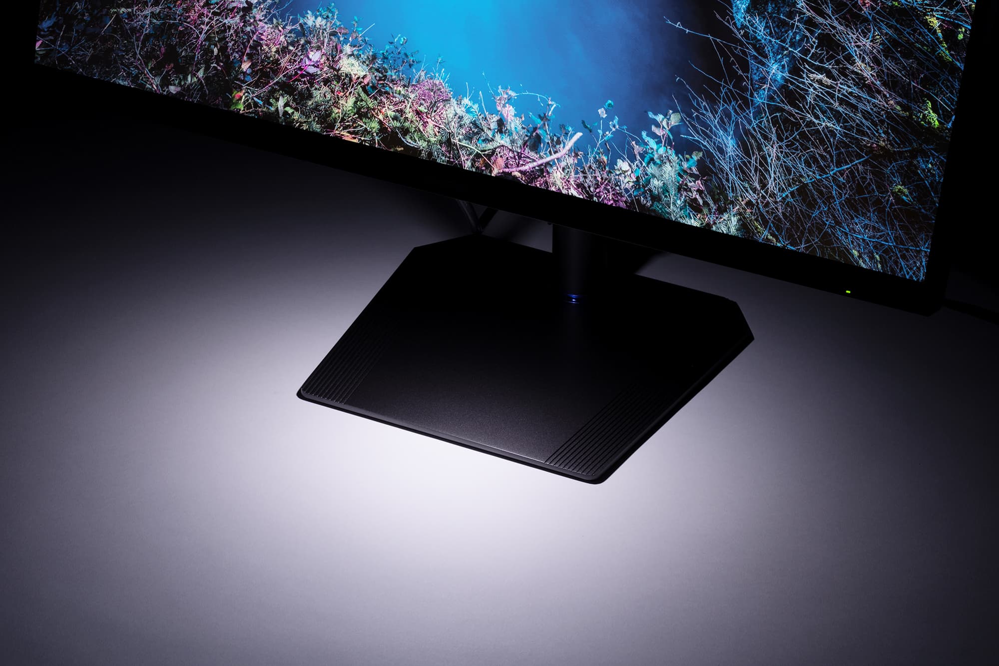 Несущие элементы подставки изготовлены из толстой штампованной стали и алюминиевого сплава. В частности из него сделаны основание и стойка подставки, которые имеют стойкое темно-темно-серое слегка серебристое покрытие. Основание подставки имеет большую площадь, что обеспечивает монитору хорошую устойчивость, при этом сверху на горизонтальную поверхность основания можно положить край клавиатуры или офисную мелочовку. Резиновые накладки снизу на основании подставки защищают поверхность стола от царапин и предотвращают скольжение монитора на гладких поверхностях.