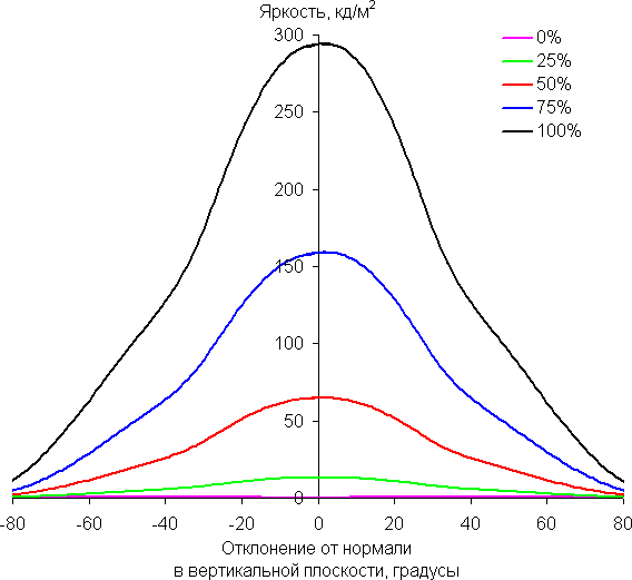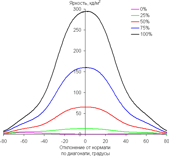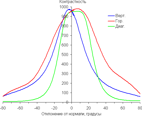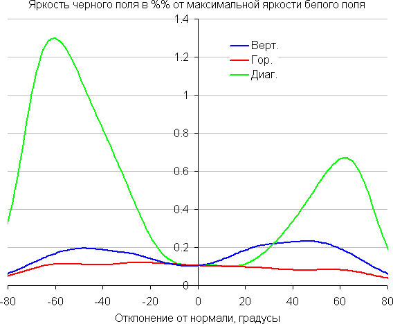 По скорости снижения яркости углы обзора неширокие, что для матрицы типа IPS нехарактерно. При отклонении в диагональном направлении яркость черного поля начинает резко возрастать уже при 20°-30° отклонения от перпендикуляра к экрану. Если сидеть не очень далеко от экрана, то черное поле по углам будет заметно светлее, чем в центре (приобретая слегка красноватый или желтоватый оттенок). Контрастность в диапазоне углов ±82° только в случае отклонения по диагонали приближается к отметке 10:1 и опускается ниже при 62° в одном направлении.