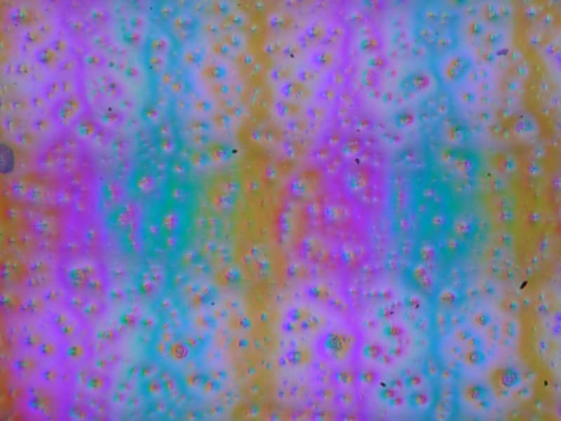 Зерно этих дефектов в несколько раз меньше размеров субпикселей (масштаб этих двух фотографий одинаковый), поэтому фокусировка на микродефектах и «перескок» фокуса по субпикселям при изменении угла зрения выражены слабо, из-за этого нет и «кристаллического» эффекта.