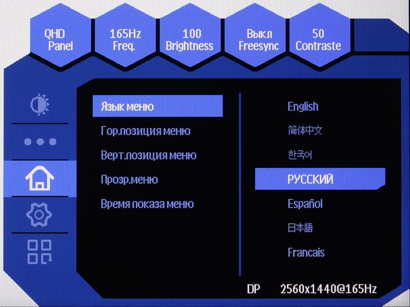 Навигация по меню очень удобная, так как все делается только джойстиком, не нужно переносить палец на кнопки, и количество необходимых действий разумно сокращено, к тому же списки зациклены. При настройке изображения меню остается на экране — это несколько мешает оценке вносимых изменений. При необходимости можно установить уровень прозрачности фона меню, выбрать тайм-аут автоматического выхода из меню и переместить меню по горизонтали и по вертикали. Есть русская версия экранного меню.