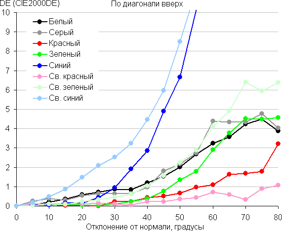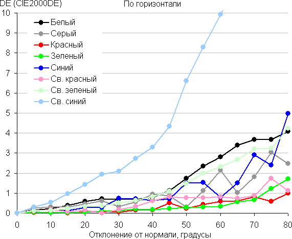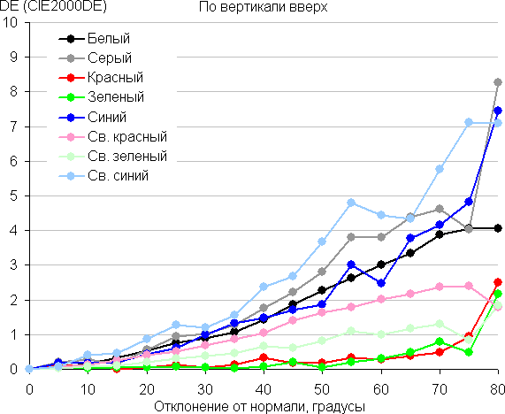 Для количественной характеристики изменения цветопередачи мы провели колориметрические измерения для белого, серого (127, 127, 127), красного, зеленого и синего, а также светло-красного, светло-зеленого и светло-синего полей во весь экран с использованием установки, подобной той, что применялась в предыдущем тесте. Измерения проводились в диапазоне углов от 0° (датчик направлен перпендикулярно к экрану) до 80° с шагом в 5°. Полученные значения интенсивностей были пересчитаны в ΔE относительно замера каждого поля при перпендикулярном положении датчика относительно экрана. Результаты представлены ниже: