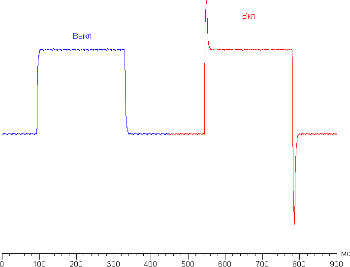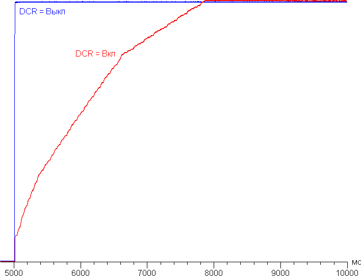 При включении режима DCR с динамическим управлением яркости установившаяся контрастность формально возрастает, но не до бесконечности, так как даже на черном поле во весь экран подсветка совсем не выключается. График ниже показывает, как увеличивается яркость (вертикальная ось) при переключении с черного поля (после пяти секунд вывода) на белое при выключенной и включенной динамической подстройке яркости:
