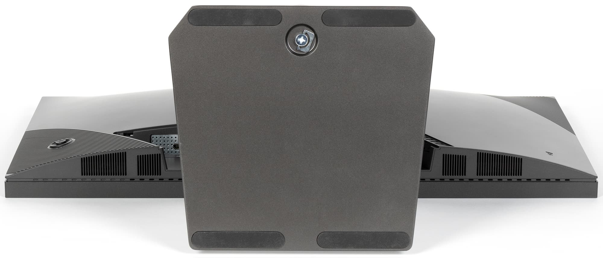 Подключать кабели к монитору удобно только при перевороте блока экрана в портретную ориентацию. Также на задней панели можно обнаружить разъем для кенсингтонского замка. Нишу с разъемами можно закрыть декоративным щитком, а отходящие кабели — прижать фиксатором к стойке подставки: так сзади монитор выглядит аккуратнее.