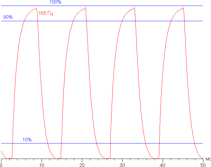 Приведем зависимость яркости от времени при чередовании белого и черного кадра при 165 Гц кадровой частоты (график с подписью 165 Гц):