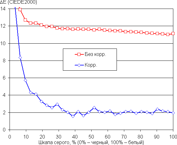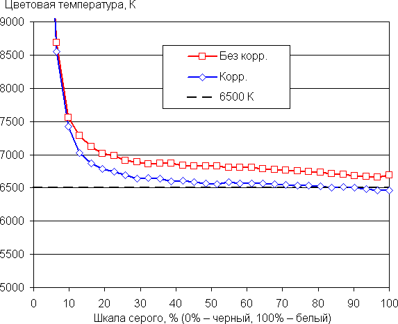 Цветовой баланс просто при выборе профиля Пользователь для настройки Цветовая температура, который обеспечивает максимальную яркость и контрастность с сохранением приемлемого качества изображения, средний, так как цветовая температура достаточно близка к стандартным 6500 К, но отклонение от спектра абсолютно черного тела (параметр ΔE) выше 10 единиц, что даже для потребительского устройства считается не очень хорошим показателем. Впрочем, при этом оба параметра мало изменяются на различных участках шкалы серого, что улучшает визуальное восприятие цветового баланса. Мы попытались вручную скорректировать цвета, регулируя усиление трех основных цветов. Удалось еще больше приблизить цветовую температуру к 6500 К и значительно снизить ΔE, сохранив невысокую вариацию этих параметров на шкале серого, но максимальная яркость при этом снизилась до 286 кд/м². Графики ниже показывают цветовую температуру на различных участках шкалы серого и ΔE в случае отсутствия вмешательства (Без корр.) и после ручной коррекции (Корр., усиление красного, зеленого и синего — 48, 50 и 47):
