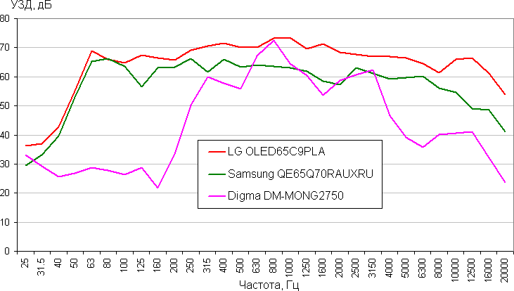Встроенные громкоговорители звучат согласно их размерам и акустическому окружению — настолько громко, чтобы сидящий перед монитором пользователь уверенно расслышал системные сигналы, без низких частот вообще, с выраженным «пластиковым» призвуком из-за резонансов корпуса, стереофонический эффект присутствует. Сравним АЧХ этого монитора с АЧХ двух телевизоров высшего класса (воспроизводился розовый шум, уровни звукового давления в 1/3 октавах записывал шумомер Октава-111):
