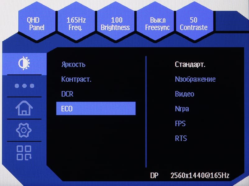Присутствует набор предустановленных фиксированных значений ряда настроек в виде нескольких заводских профилей (список ECO). В профиле Стандарт. можно изменять все настройки. Настройки запоминаются для каждого входа. Несколько режимов геометрической трансформации помогут подобрать оптимальный вариант в случае источника с неродным для монитора разрешением и соотношением сторон.