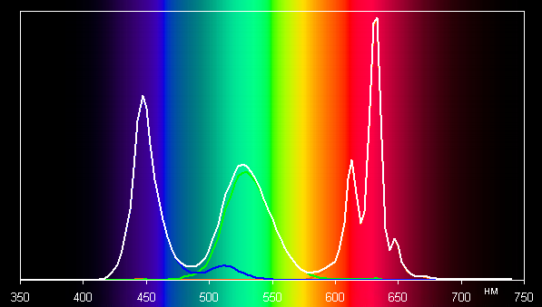 Ниже приведен спектр для белого поля (белая линия), наложенный на спектры красного, зеленого и синего полей (линии соответствующих цветов) в случае исходного цветового охвата: