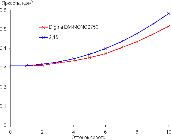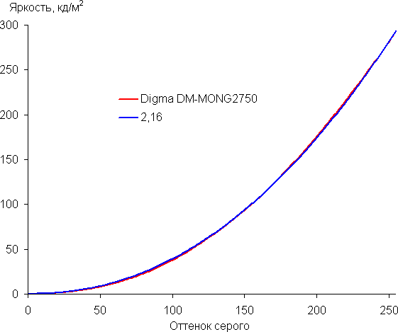 Аппроксимация полученной гамма-кривой дала показатель 2,16, что совсем немного меньше стандартного значения 2,2, при этом реальная гамма-кривая мало отклоняется от аппроксимирующей степенной функции: