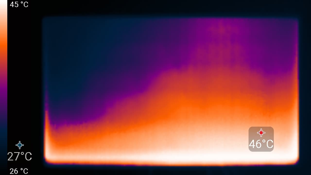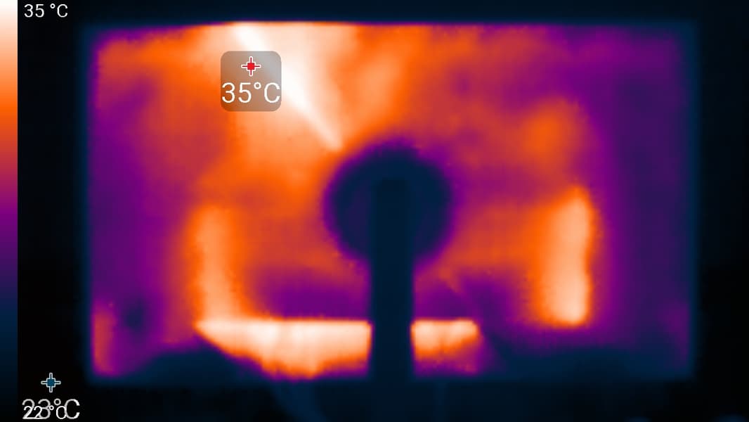 Нагрев монитора можно оценить по приведенному снимку с ИК-камеры, полученному после долговременной работы монитора на максимальной яркости в помещении с температурой примерно 24 °C: