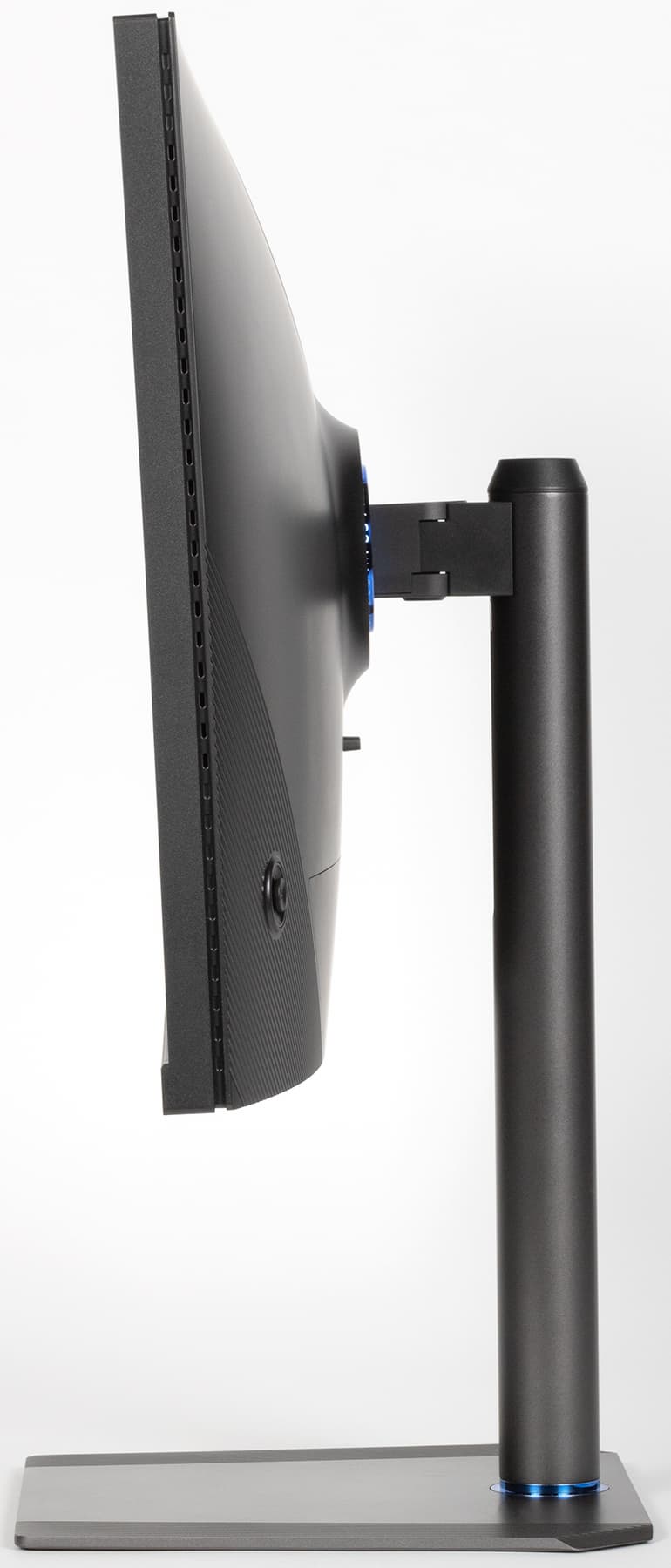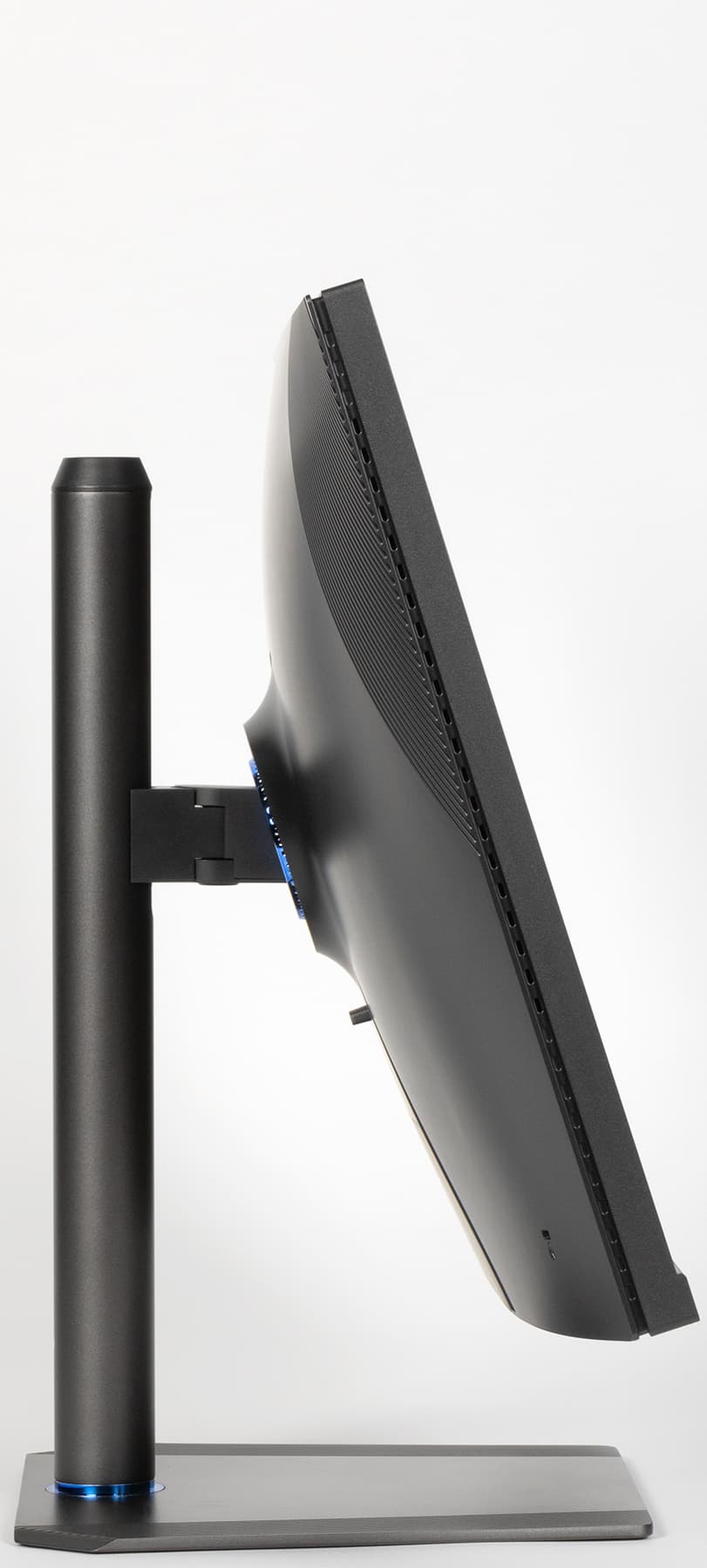 В целом дизайн умеренно игровой, поэтому с точки зрения внешнего вида монитор можно считать универсальным. Панели монитора и кожухи подставки изготовлены из темно-темно-серого пластика с матовой и слегка серебристой поверхностью. В нижней части стойки подставки и у узла крепления блока экрана есть декоративные вставки из алюминиевого сплава с покрытием из фиолетовой эмали. Странно, что не красные.
