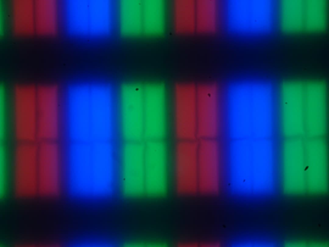 Четкое изображение структуры пикселей из-за матовой поверхности получить не удается, впрочем, на фрагменте ниже можно разглядеть типичную для VA структуру в виде параллельных полосок, а также что каждый субпиксель делится на четыре равных домена, в которых полоски ориентированы под разными углами (черные точки — это пыль на матрице фотоаппарата):