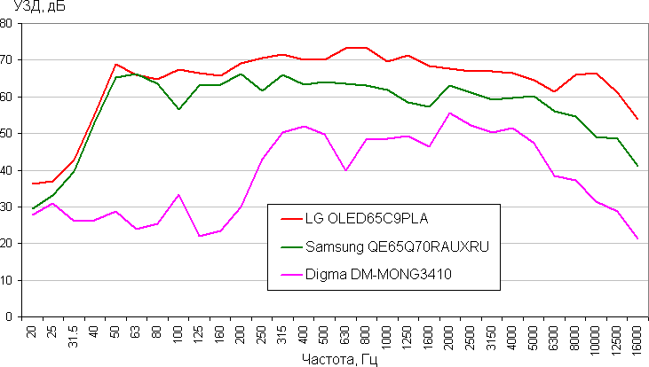 Качество встроенных громкоговорителей также невысокое. Даже для сидящего перед монитором пользователя они негромкие, низких частот нет совсем, есть выраженный «пластиковый» призвук из-за резонансов корпуса, но хоть стереофонический эффект выражен. Сравним АЧХ этого монитора с АЧХ двух телевизоров высшего класса (воспроизводился розовый шум, уровни звукового давления в 1/3 октавах записывал шумомер Октава-110А-Эко, 30 дБ — это примерно фоновый уровень шума):