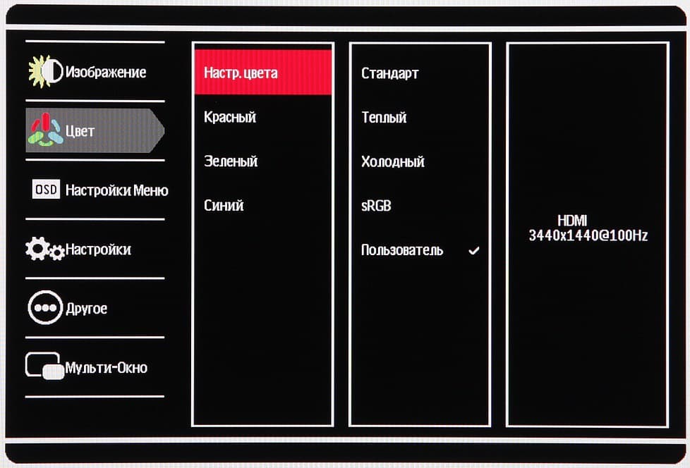 Настроек, влияющих на яркостный и цветовой баланс, не очень много, что для игрового монитора ожидаемо. Есть регулировки яркости (подсветки) и контрастности, функции принудительного снижения интенсивности синей компоненты и динамической регулировки яркости подсветки. Можно корректировать цветовой баланс выбором цветового профиля из четырех предустановленных или пользовательского, в котором цветовой баланс можно подправить регулировками интенсивности трех основных цветов.