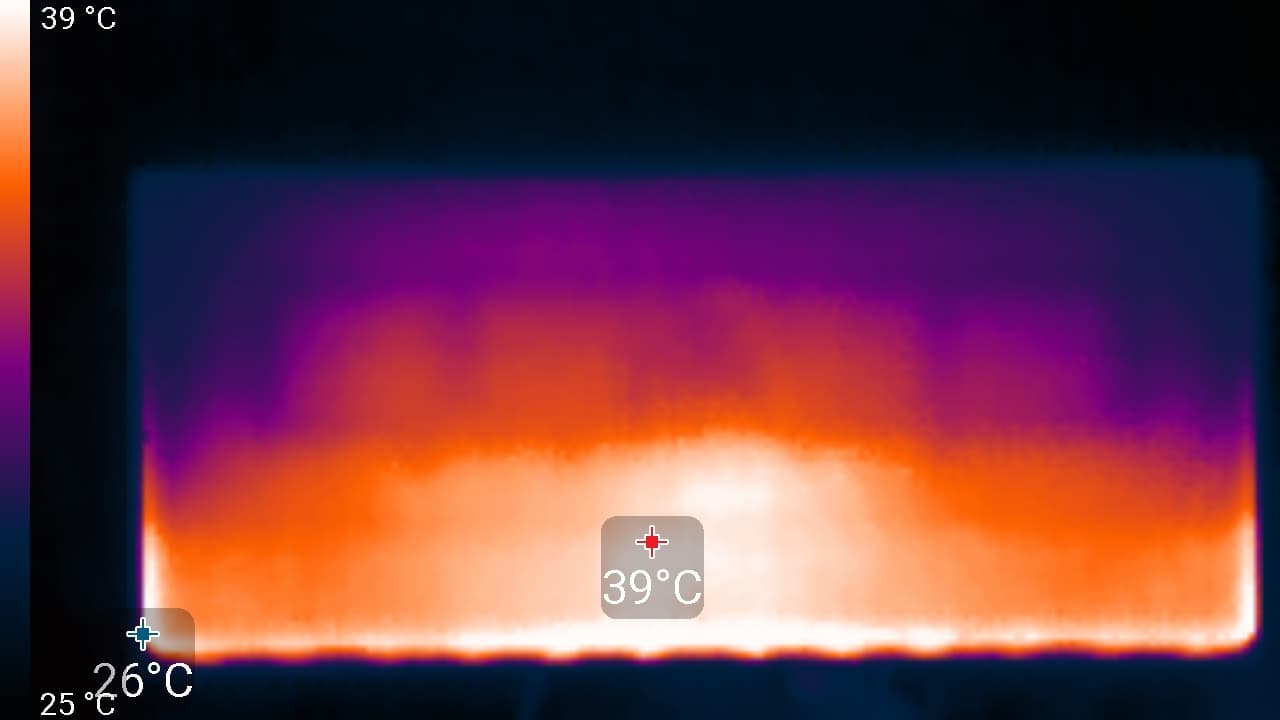 По распределению областей нагрева, можно предположить, что внизу находится светодиодная линейка подсветки экрана. Нагрев монитора умеренный.
