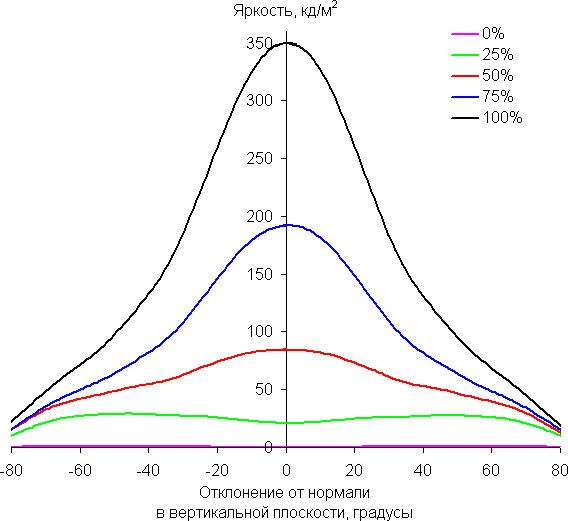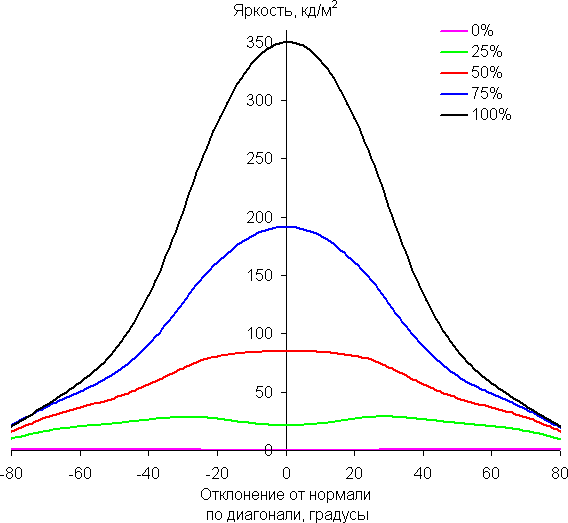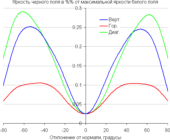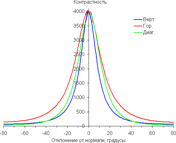 По скорости падения яркости углы обзора неширокие. Отметим примерно одинаковый характер уменьшения яркости при отклонении от перпендикуляра к экрану во всех трех направлениях, при этом графики не пересекаются в значимом диапазоне измеряемых углов. При отклонении в диагональном направлении яркость черного поля достигает большего значения, чем в двух других случаях. Однако максимум яркости черного поля все равно гораздо меньше, чем в случае типичного монитора на матрице IPS. Контрастность в диапазоне углов ±82° остается существенно выше значения 10:1.