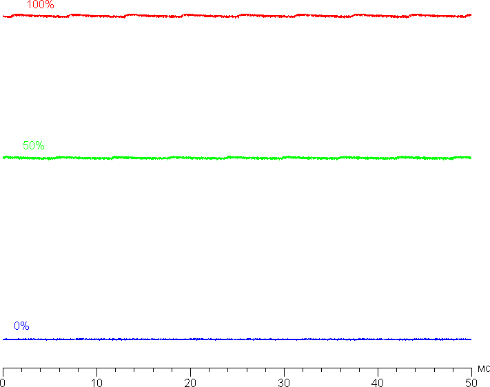 На любом уровне яркости модуляция подсветки отсутствует, что исключает видимое мерцание экрана. Для тех, кто привык распознавать знакомое сокращение, уточним: ШИМ отсутствует. В доказательство приведем графики зависимости яркости (вертикальная ось) от времени (горизонтальная ось) при различных значениях настройки яркости: