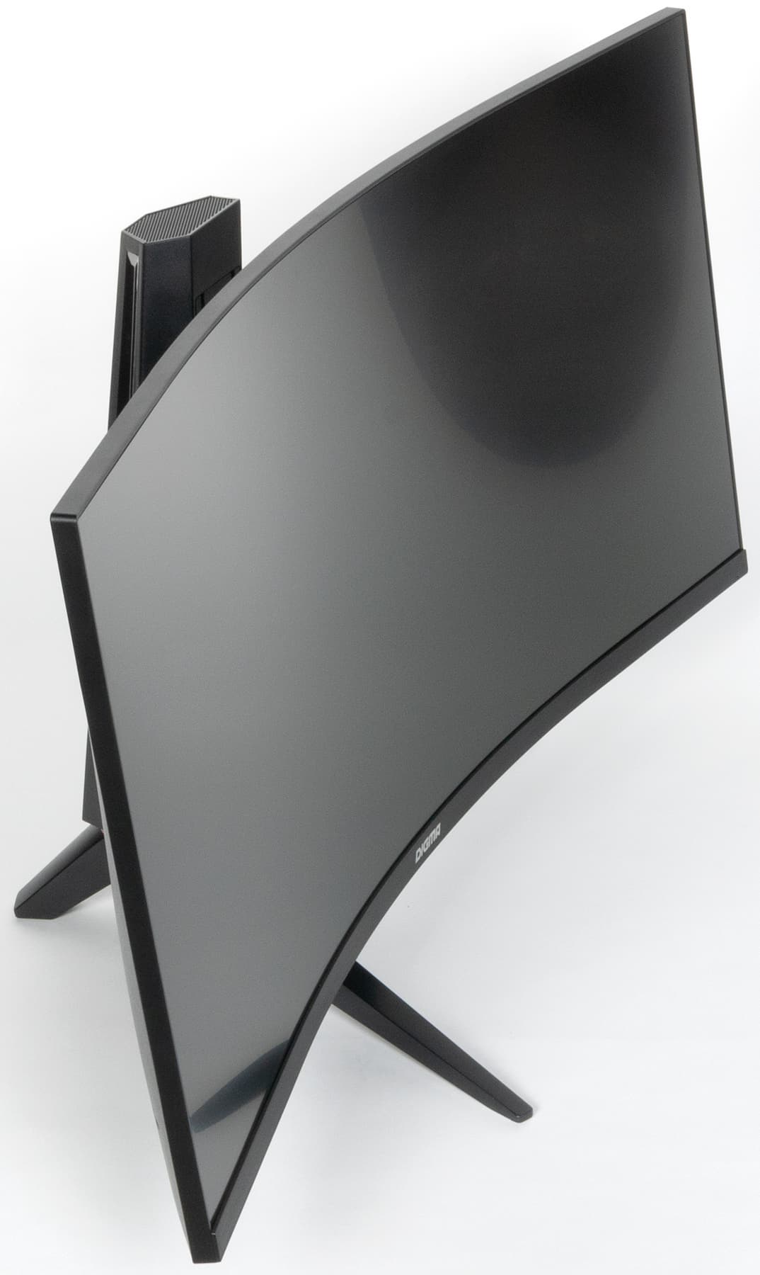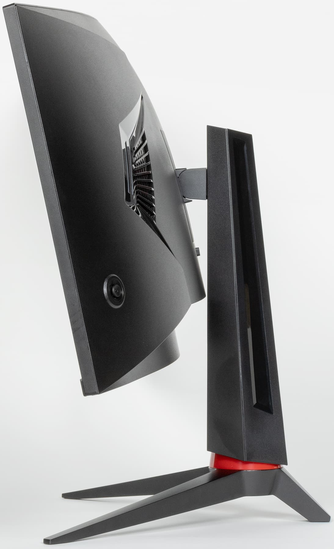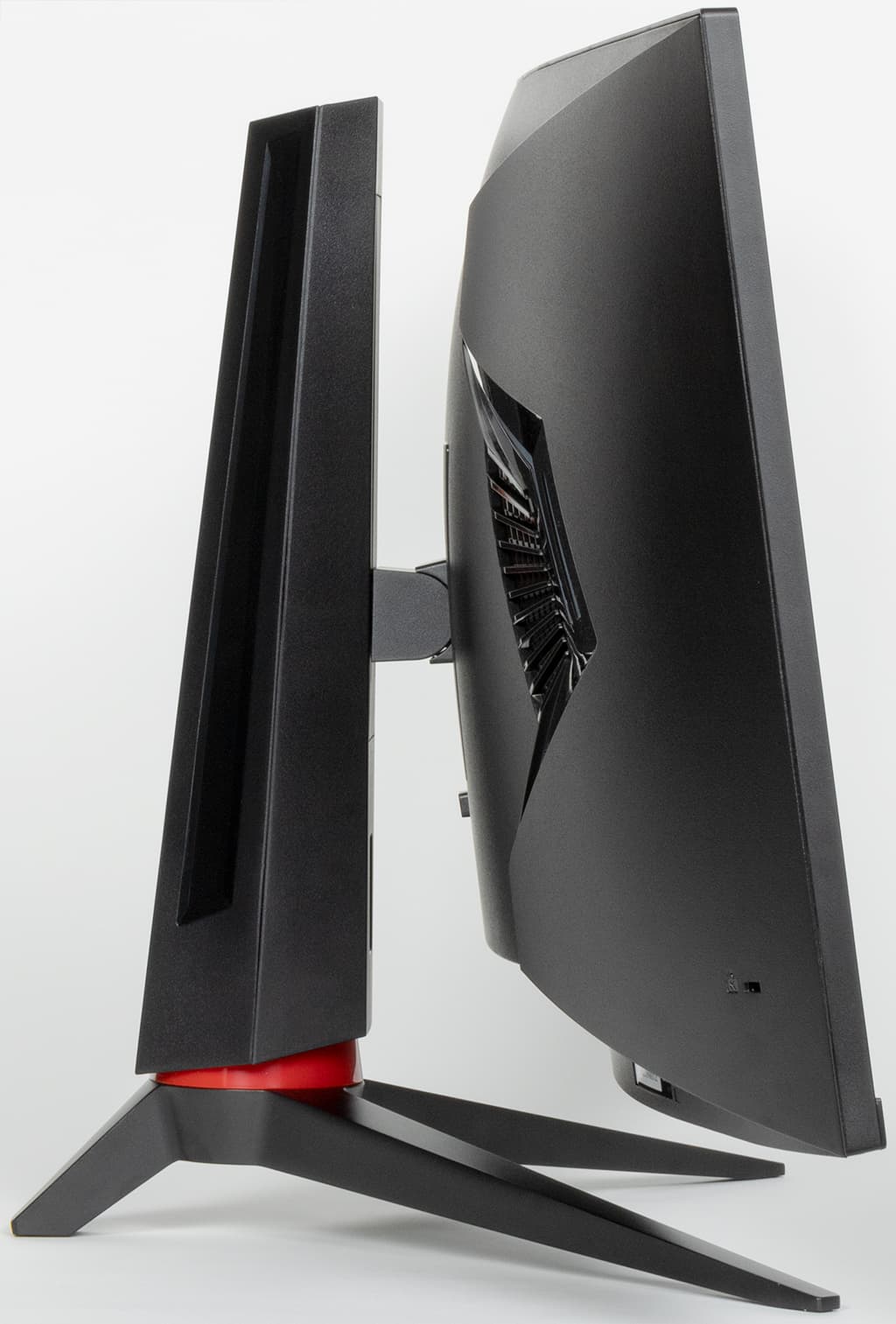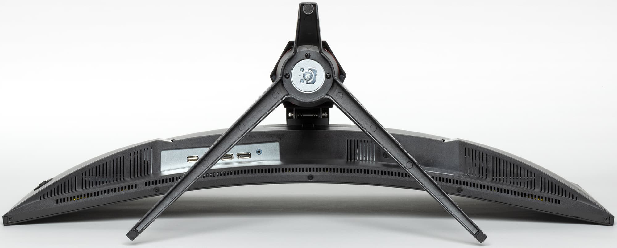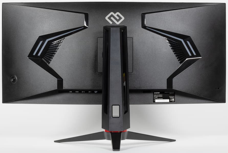 Дизайн умеренно игровой. Внешние элементы блока экрана, кожухи стойки и узла крепления блока экрана изготовлены из черного пластика в основном с матовой поверхностью, но встречаются и глянцевые участки. Ориентацию на игроков выдают трехпалое основание подставки, изготовленное из алюминиевого сплава и имеющее стойкое матовое черное покрытие, красное кольцо в нижней части стойки, а также оформление задней панели и подсветка на ней. Внешняя поверхность матрицы черная, полуматовая (зеркальность хорошо выражена), внешний слой матрицы жесткий. Плоскость экрана изогнута по цилиндру так, что правый и левый край немного выдвинуты вперед. Согласно нашим оценкам, радиус изгиба в центральной части экрана равен порядка 1,2 м, но к краям экран становится все более плоским на расстоянии 12 см от края кривизна пропадает, что, впрочем, характерно для всех изогнутых ЖК-экранов. Спереди экран выглядит как монолитная поверхность, ограниченная снизу неширокой планкой, а по периметру — узкой окантовкой. Выведя изображение на экран, можно увидеть, что на самом деле между внешними границами экрана и собственно областью отображения есть неширокие поля.