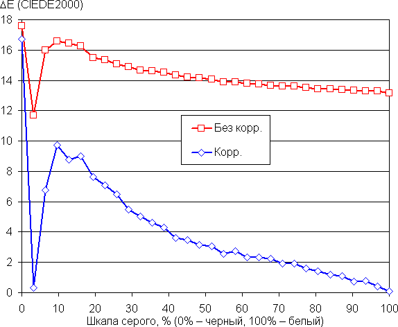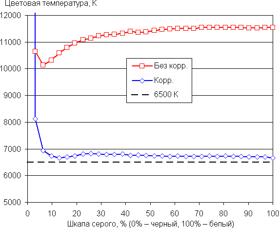 Цветовой баланс в самом ярком режиме (то есть без коррекции) сильно отличается от стандартного, так как цветовая температура на различных участках шкалы серого гораздо выше стандартных 6500 К, а отклонение от спектра абсолютно черного тела (параметр ΔE) выше 10 единиц. Мы попытались его улучшить, регулируя усиление трех основных цветов. Удалось хорошо приблизить цветовую температуру к 6500 К и на белом поле снизить ΔE, но вариация второго параметра возросла, а максимальная яркость (и контрастность) снизилась более чем в два раза. Графики ниже показывают цветовую температуру на различных участках шкалы серого и ΔE в случае отсутствия вмешательства и после ручной коррекции (R = 50, G = 40, B = 35):