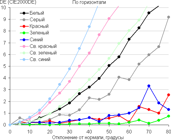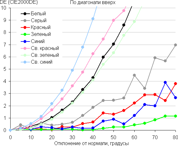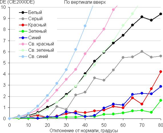 Для количественной характеристики изменения цветопередачи мы провели колориметрические измерения для белого, серого (127, 127, 127), красного, зеленого и синего, а также светло-красного, светло-зеленого и светло-синего полей во весь экран с использованием установки, подобной той, что применялась в предыдущем тесте. Измерения проводились в диапазоне углов от 0° (датчик направлен перпендикулярно к экрану) до 80° с шагом в 5°. Полученные значения интенсивностей были пересчитаны в ΔE относительно замера каждого поля при перпендикулярном положении датчика относительно экрана. Результаты представлены ниже:
