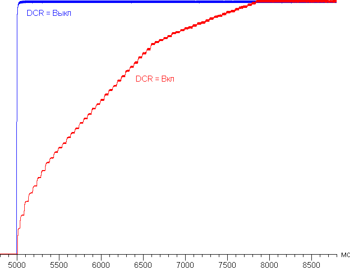 При включении режима DCR с динамическим управлением яркости установившаяся междукадровая контрастность формально возрастает, но не до бесконечности, так как даже на черном поле во весь экран подсветка совсем не выключается. График ниже показывает, как увеличивается яркость (вертикальная ось) при переключении с черного поля во весь экран (после 5 секунд выдержки) на белое поле во весь экран при выключенной и включенной динамической подстройки яркости: