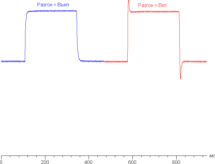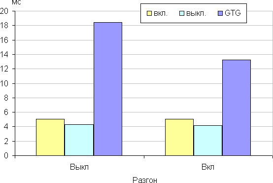 Время отклика зависит от значения настройки Разгон, которая управляет разгоном матрицы. График ниже показывает, как меняется время включения и выключения при переходе черный-белый-черный (столбики «вкл.» и «выкл.»), а также среднее суммарное время для переходов между полутонами (столбики «GTG») для двух значений этой настройки: