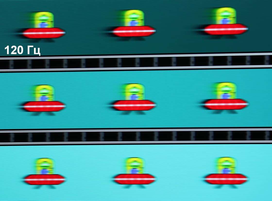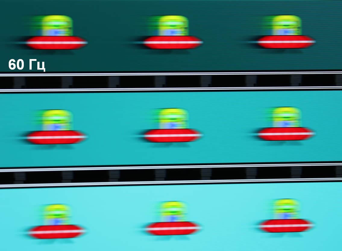 Попробуем представить, что было бы в случае матрицы с мгновенным переключением пикселей. Для нее при 60 Гц объект со скоростью движения 960 пиксель/с размывается на 16 пикселей, при 120 Гц — на 8 пикселей (скорость 960 пиксель/с), при 165 Гц — на 6 пикселей (скорость 990 пиксель/с). Размывается, так как фокус зрения движется с указанной скоростью, а объект неподвижно выводится на 1/60, 1/120 или на 1/165 секунды. Для иллюстрации этого сымитируем размытие на перечисленное количество пикселей: