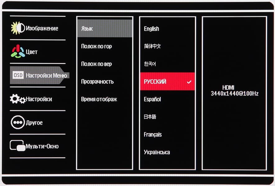 Настраиваются положение меню на экране, уровень прозрачности фона и задержка автоматического выхода из меню. Присутствует русская версия экранного меню.