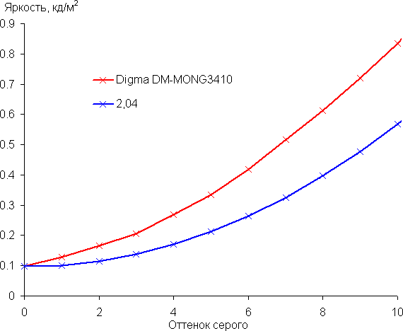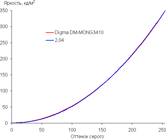 Аппроксимация полученной гамма-кривой дала показатель 2,04, что немного ниже стандартного значению 2,2, поэтому картинка чуть высветлена, но для игрового монитора это совсем не критично. При этом аппроксимирующая степенная функция мало отклоняется от реальной гамма-кривой: