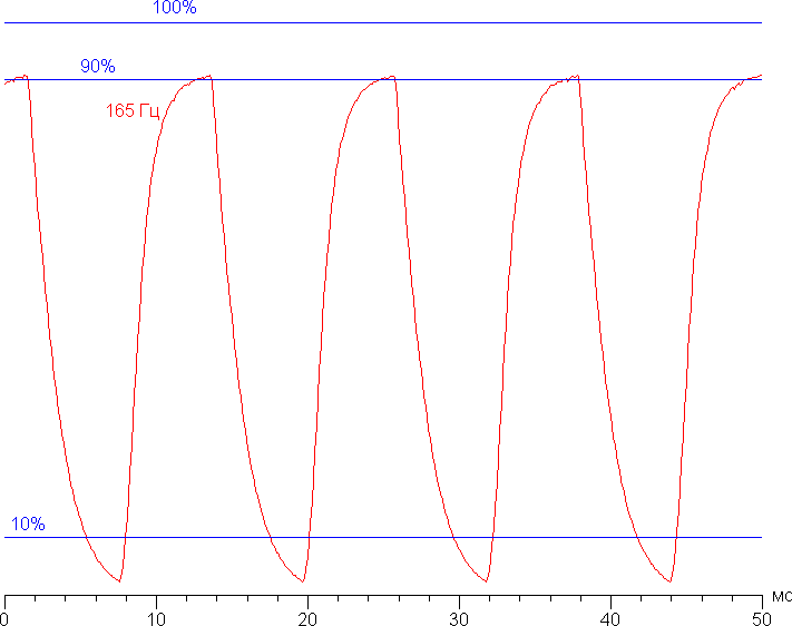 Видно, что максимальная яркость белого кадра выше уровня 90% от белого, а минимальная яркость черного кадра опускается ниже 10%. Амплитуда изменения яркости выше 80% от уровня белого, то есть согласно этому формальному критерию скорости матрицы достаточно для вывода изображения с кадровой частотой 165 Гц.
