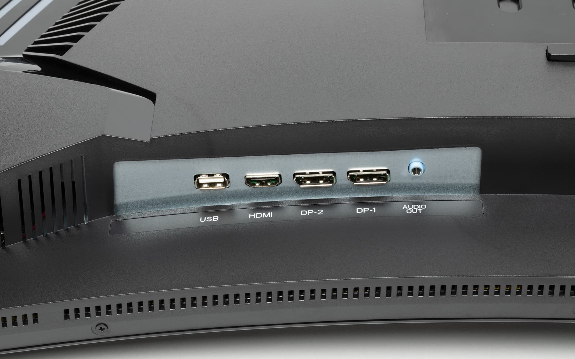 Видеовходов три — HDMI версии 2.0 и пара DisplayPort. Из них только входы DisplayPort поддерживают на вход сигнал с максимальными для этого монитора разрешением и частотой кадров. Входы выбираются в меню, кроме того, в случае отсутствия сигнала на текущем входе срабатывает автоматический выбор активного входа (эту функцию можно отключить). Эти входы способны принимать цифровые аудиосигналы (только PCM стерео), которые выводятся после преобразования в аналоговый вид на встроенные громкоговорители и через гнездо миниджек 3,5 мм. К этому гнезду можно подключить внешнюю активную акустическую систему или наушники.