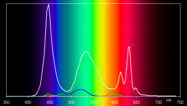 Ниже приведен спектр для белого поля (белая линия), наложенный на спектры красного, зеленого и синего полей (линии соответствующих цветов):